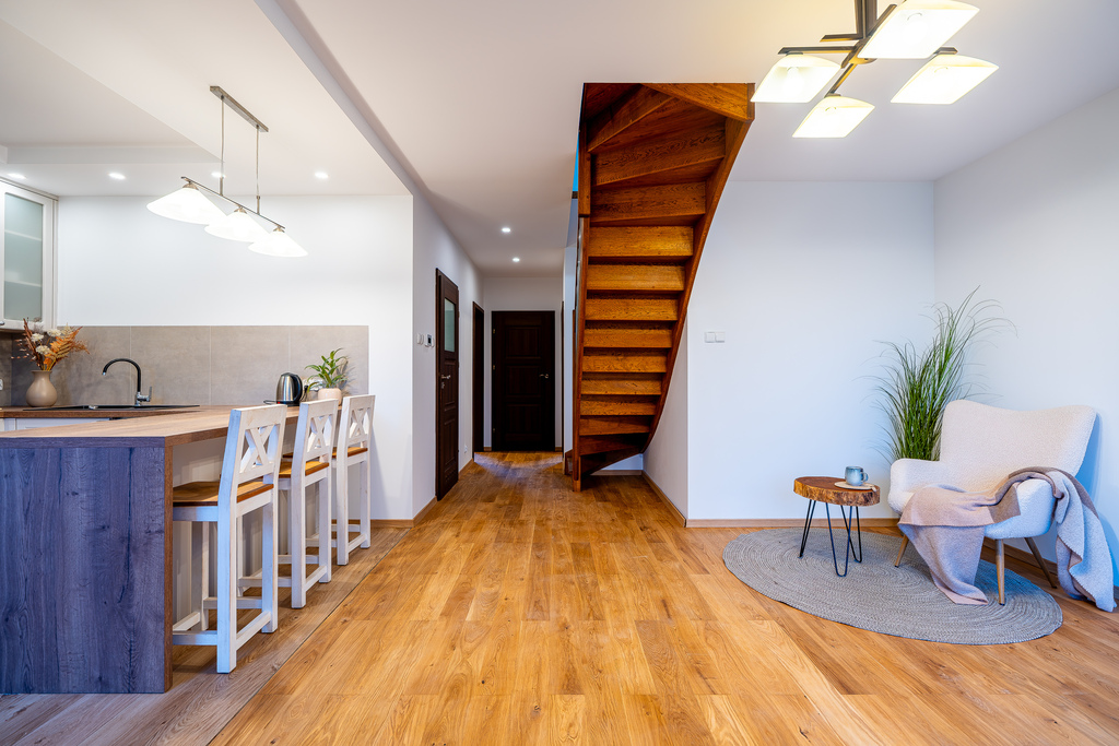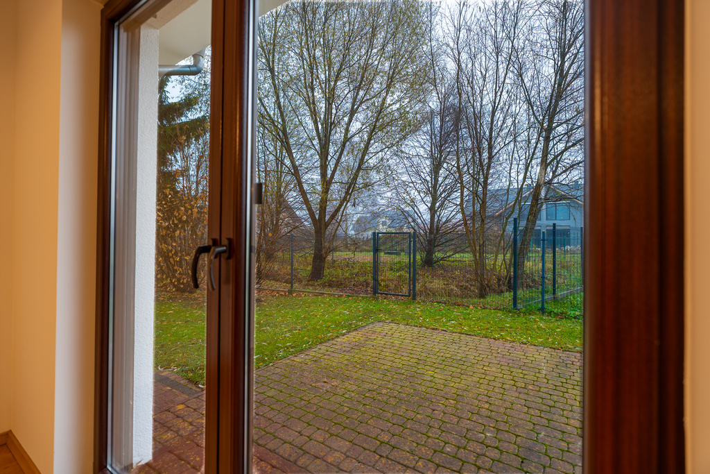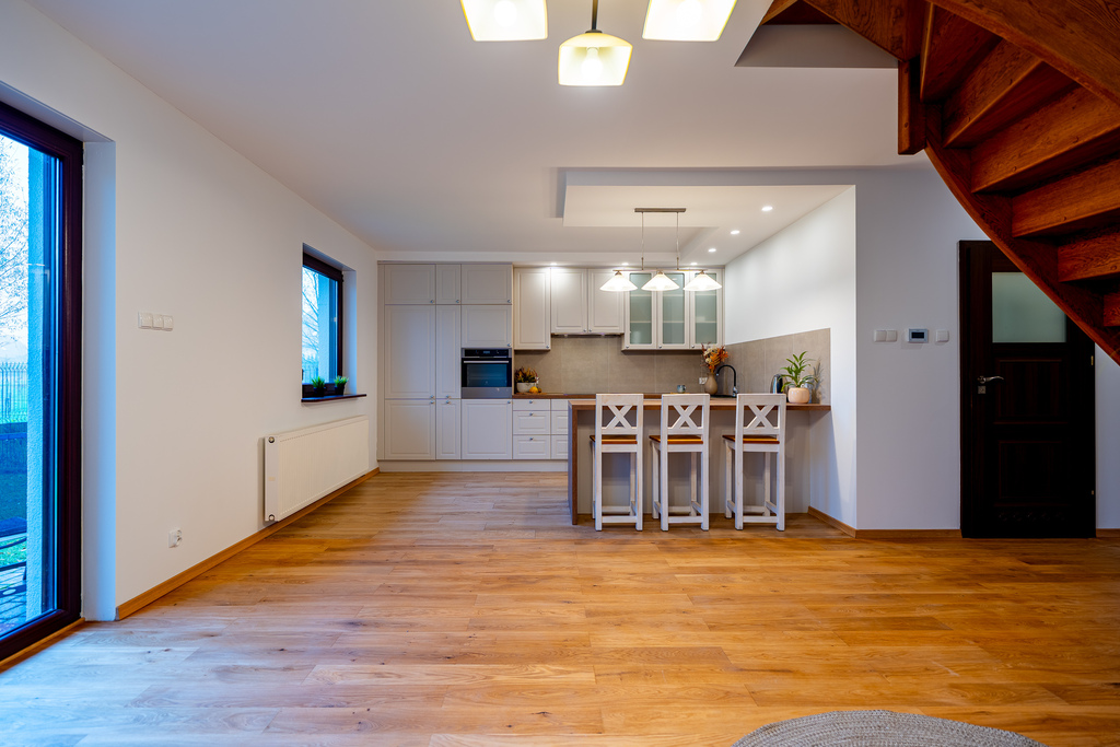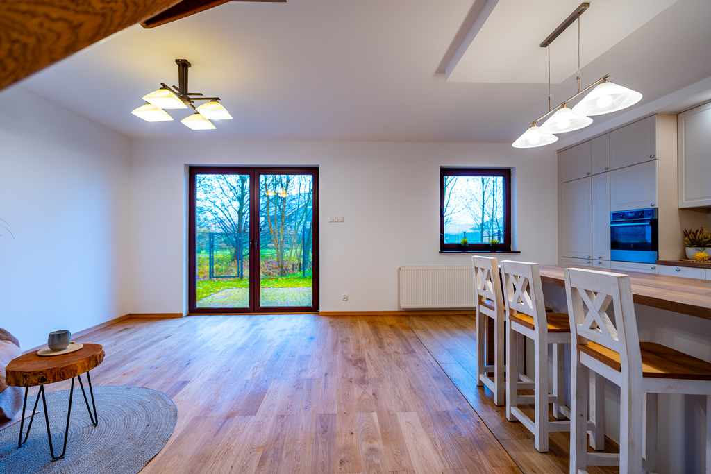 Salon z aneksem kuchennym – jasny, przytulny. Z salonu prowadzi wyjście na ogród, co naturalnie łączy przestrzeń wewnętrzną z zewnętrzną i tworzy idealne miejsce do odpoczynku i spotkań z bliskimi.