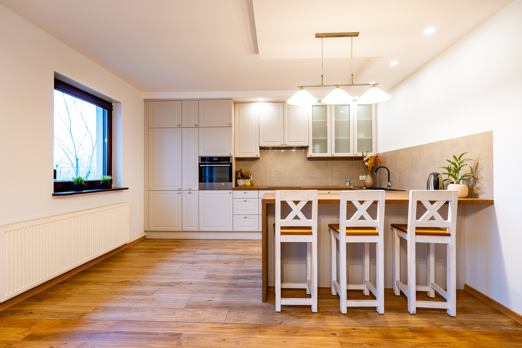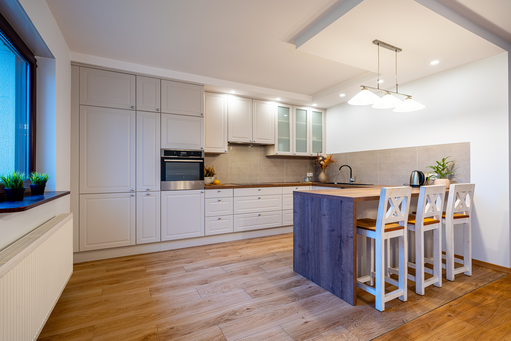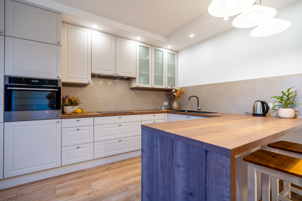 Aneks kuchenny – w pełni wyposażony, nowoczesny, zaprojektowany z myślą o funkcjonalności. Znajduje się tu kuchnia w zabudowie ze sprzętem AGD oraz efektowna wyspa, która zapewnia dodatkowy blat roboczy i doskonale sprawdza się zarówno podczas gotowania, jak i codziennych posiłków.