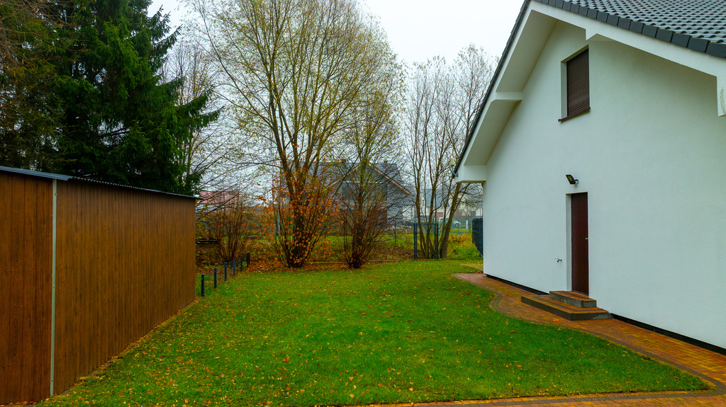 Choć działka nie należy do największych, jej przemyślane zagospodarowanie sprawia, że wizualnie oferuje znacznie więcej przestrzeni. Dom, jako zabudowa bliźniacza, został usytuowany przy granicy działki, dzięki czemu zyskujesz maksymalną, otwartą przestrzeń ogrodową po przeciwnej stronie. Na działce wykonano profesjonalny drenaż odprowadzający nadmiar wody, co znacząco poprawia warunki gruntowe i zabezpiecza budynek przed wilgocią.