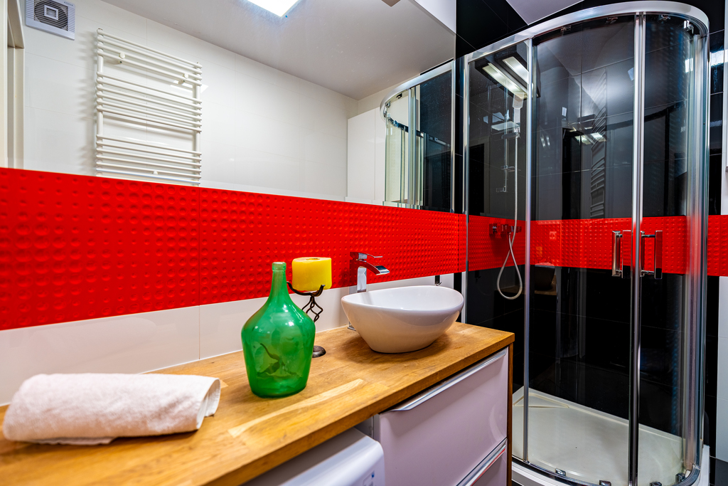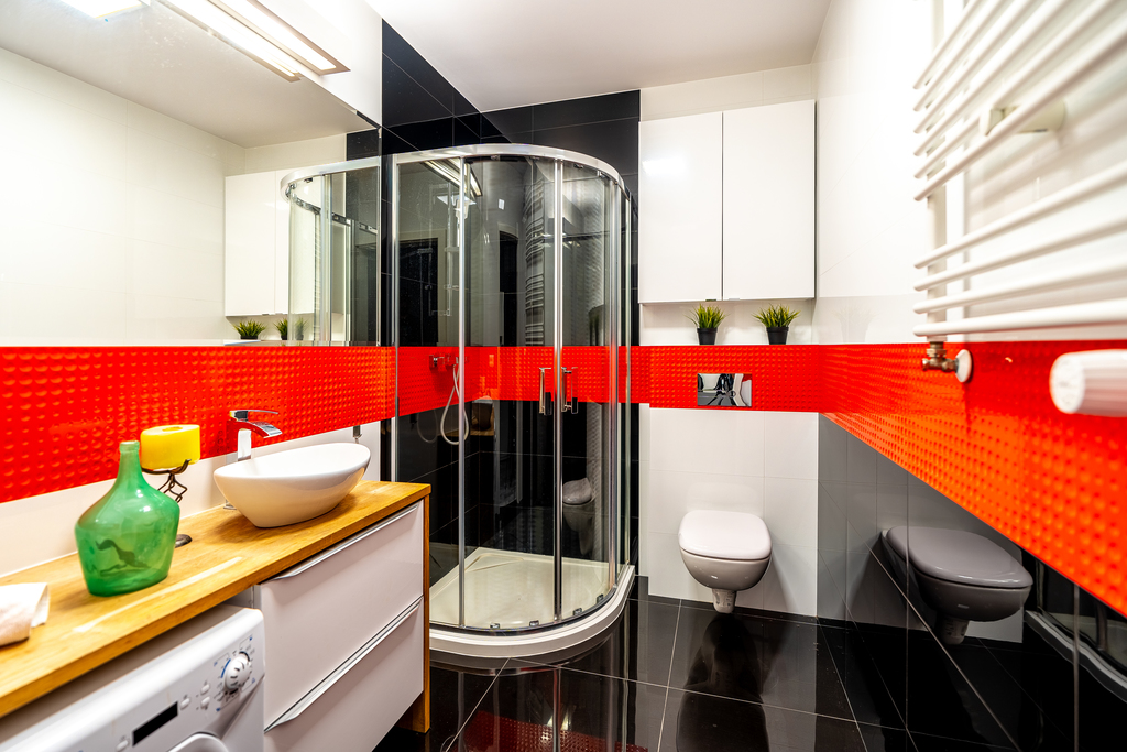 Łazienka: Elegancka łazienka z kabiną prysznicową, toaletą oraz pralką.