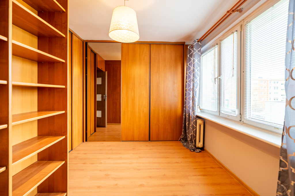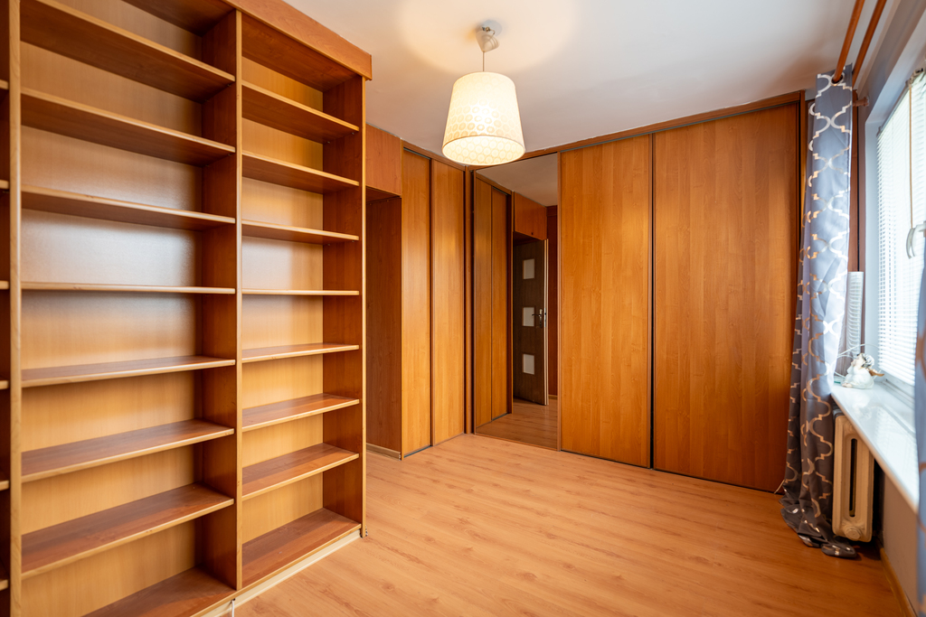 Dwa ustawne pokoje, w tym jeden z duża szafa w zabudowie oraz regałem.